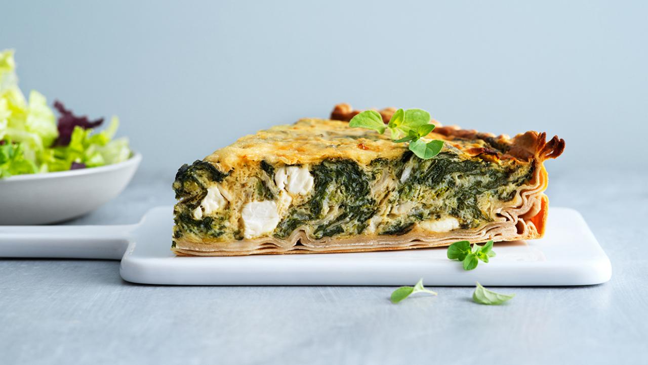 Spenat 47%, ÄGG, VETEMJÖL, gul lök, purjolök, FETAOST 4%, CREMEFRAICHE, GOUDAOST (MJÖLK, salt, syrningskultur, vegetabilisk ystenzym, färgämne E160a), rapsolja, olivolja, grönsaksbuljong, svartpeppar, vitlök och timjan.